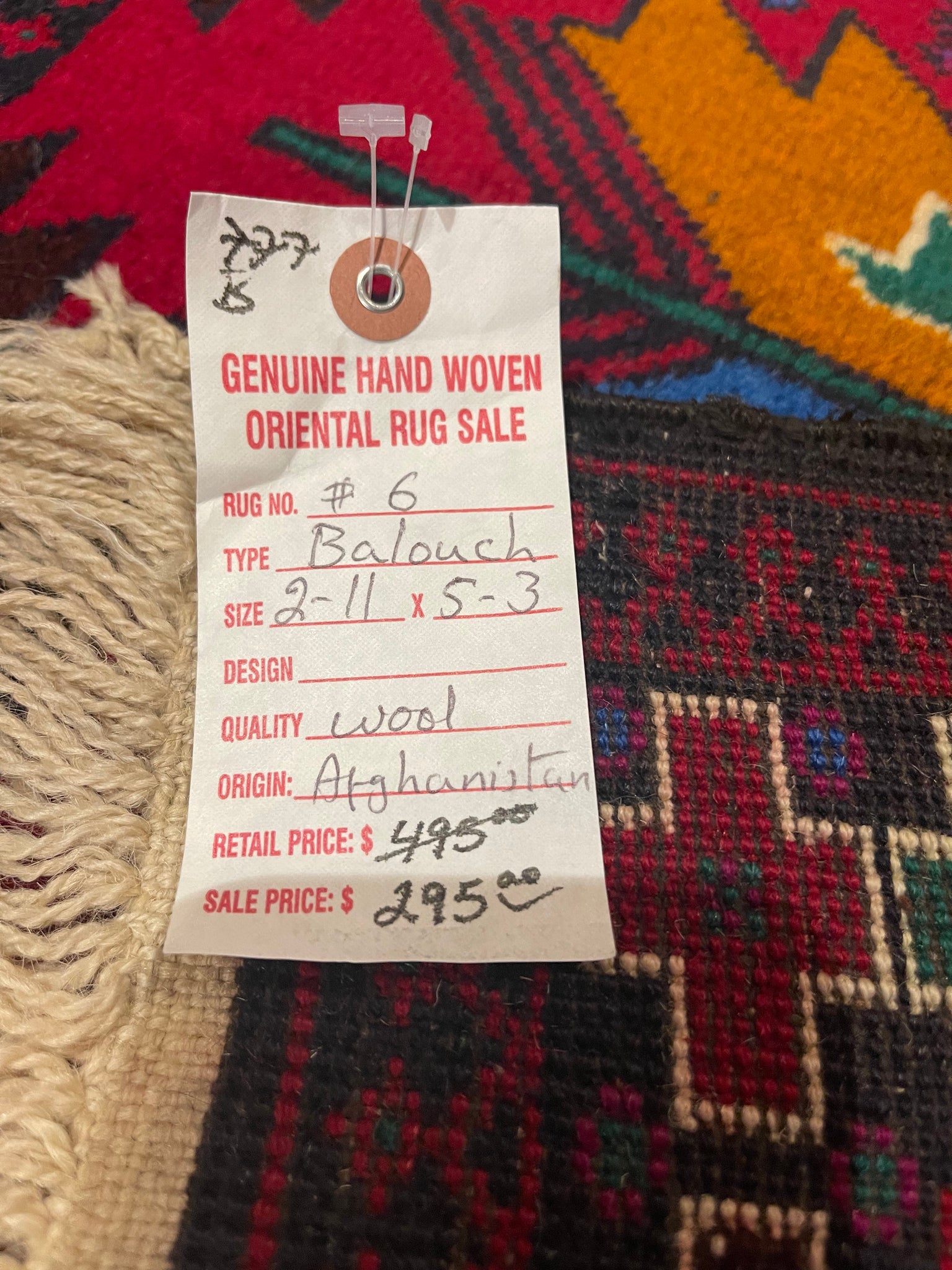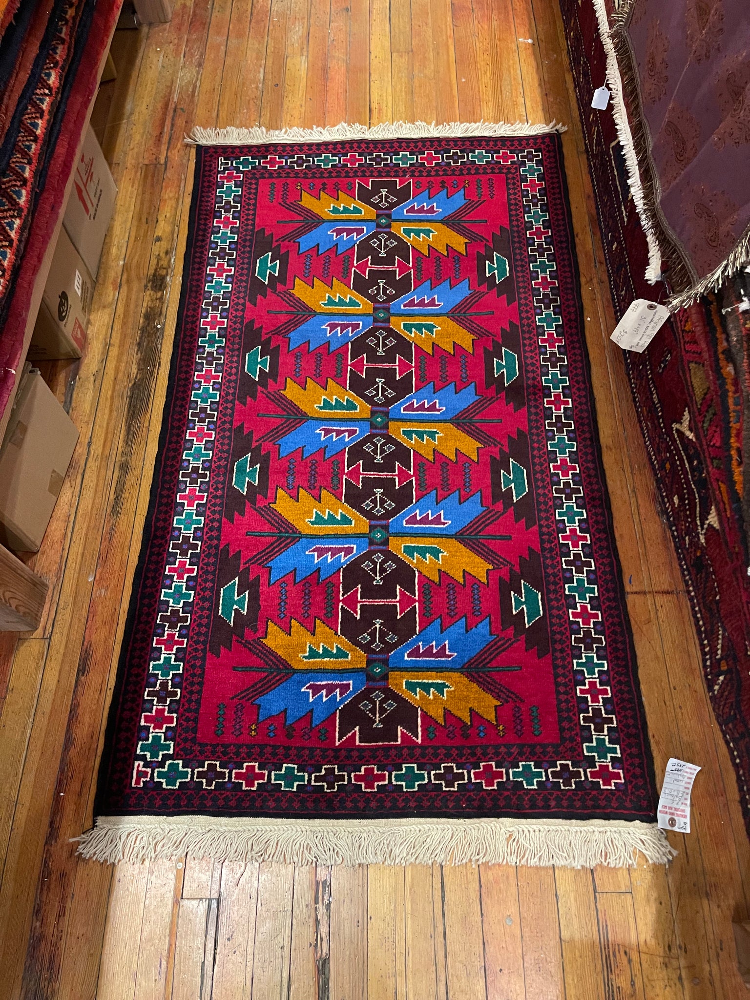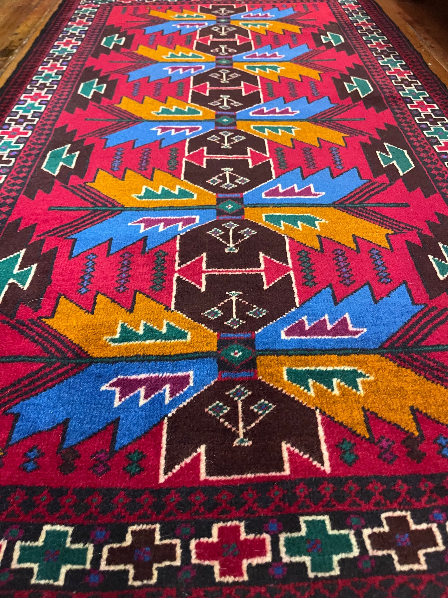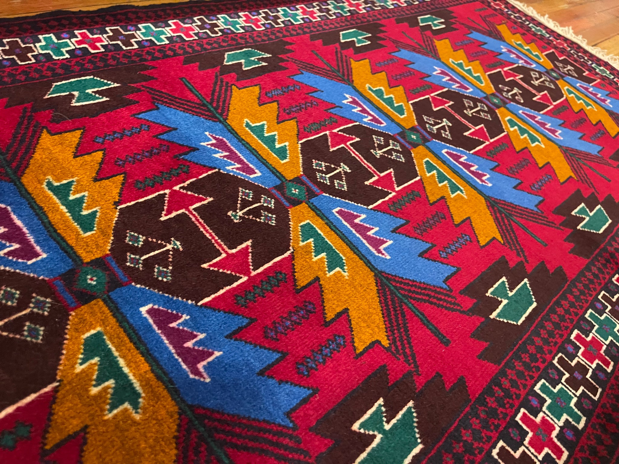 This beautiful Afghani rug presents a Baluch design and bright saturated colors that immediately catch your eye. The stunning color scheme heavily compliments the various geometric designs throughout this piece. The all wool pile is soft to the touch, the sides are secured, and the fringes are in excellent condition. This rug is clean and ready for its forever home.