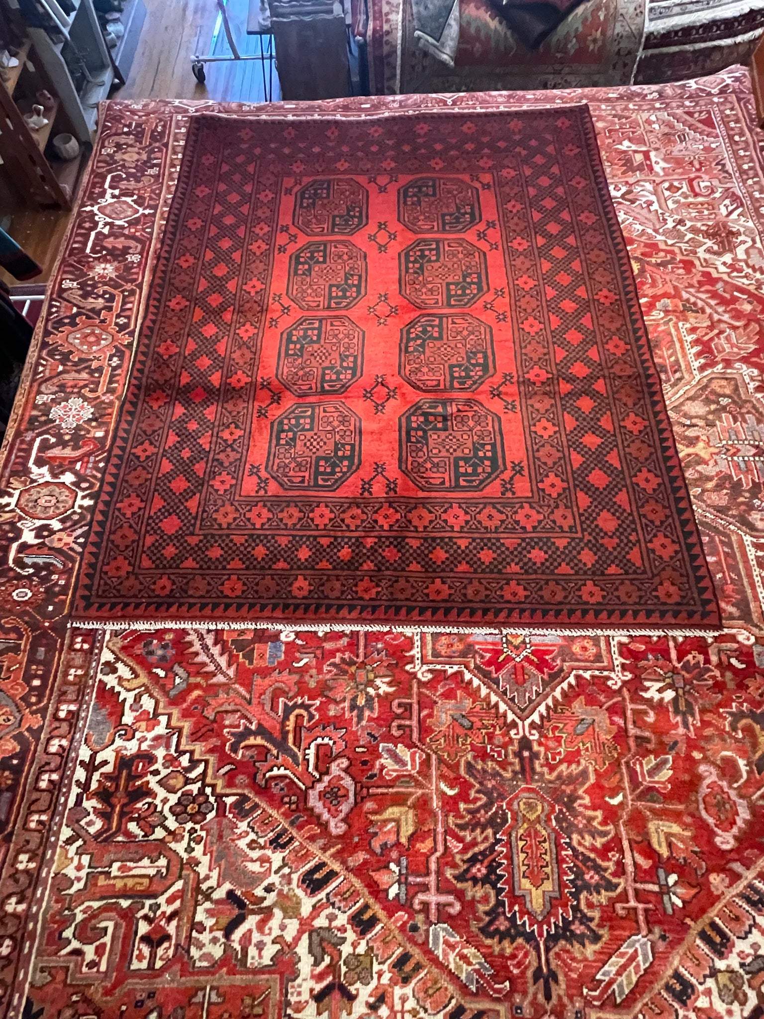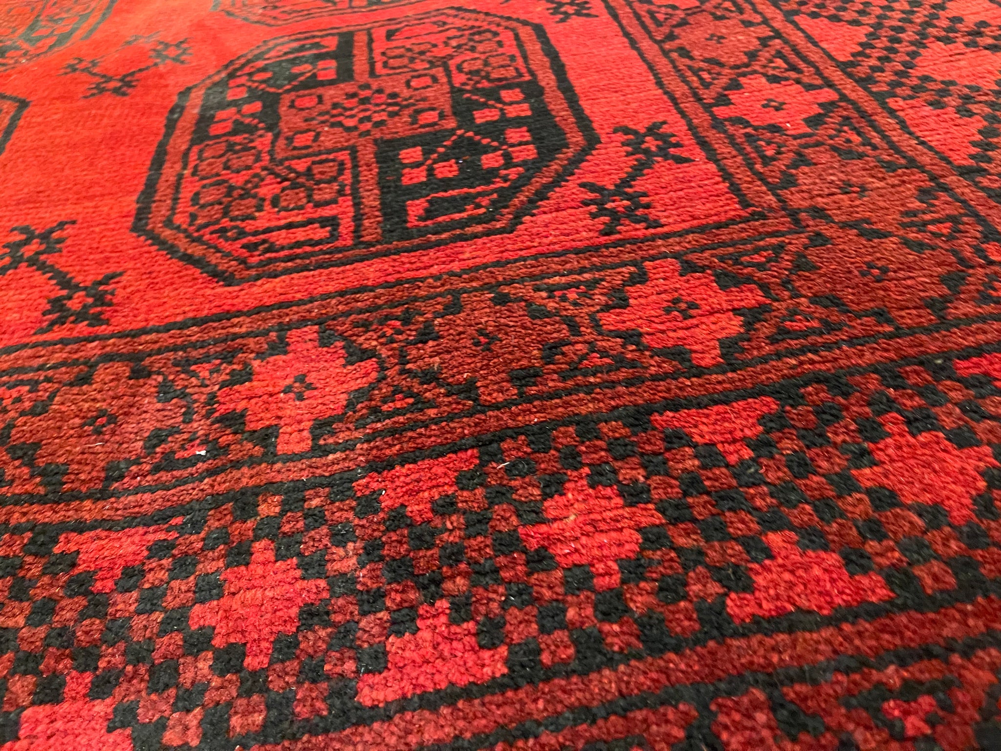 This beautiful hand knotted Afghani rug presents that classic, rich red color along with the black to give a stunning contrast. The big elephant print motifs & detailed borders are heavily complemented by the color scheme. Great size rug for most smaller spaces at home!