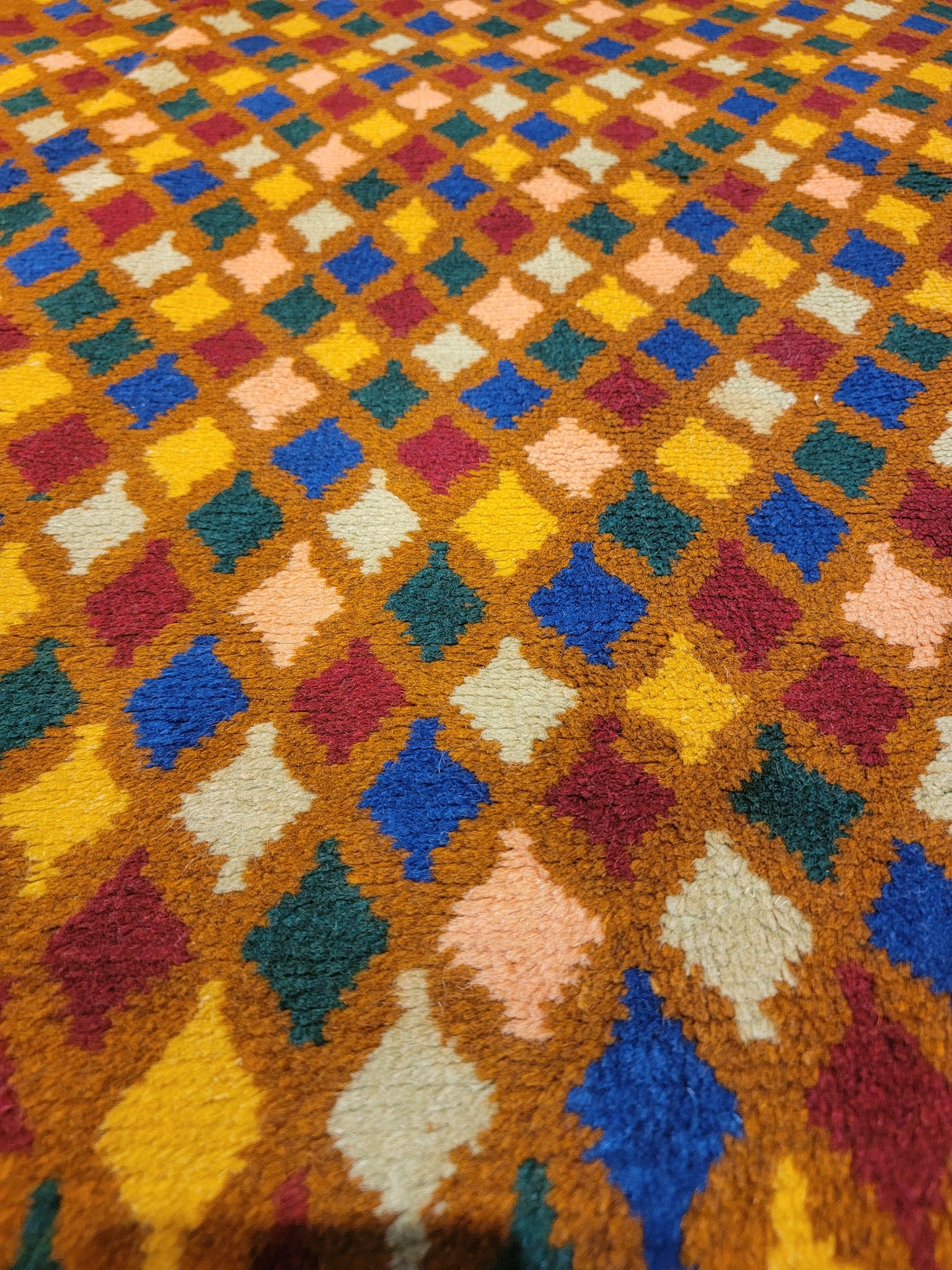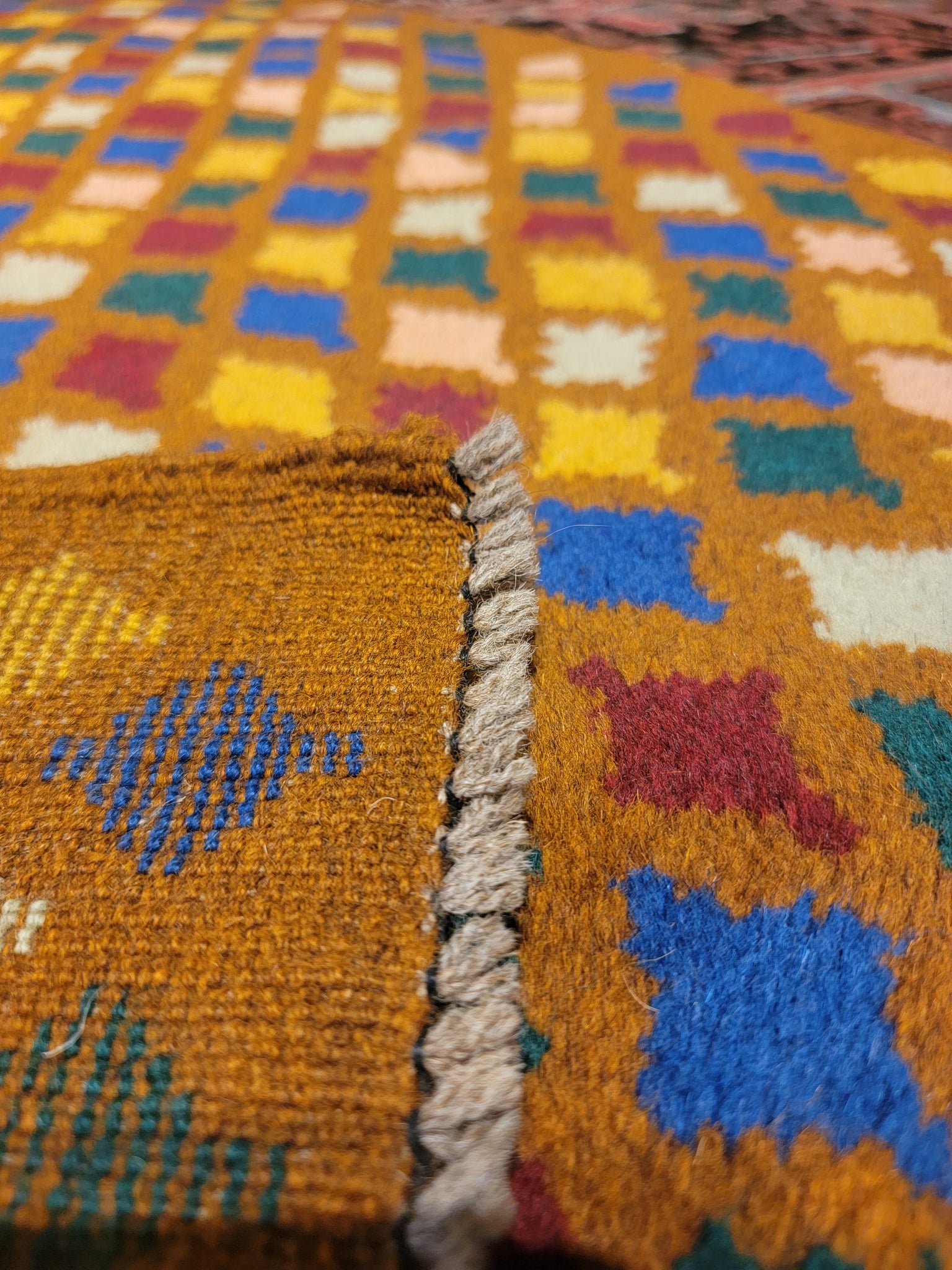 This beautiful Afghani Gabbeh presents a plethora of fun and whimsical colors that create eye-catching contrasts over a dark/burnt yellow field. This piece will surely make itself known in almost any space you put it in! The wool pile is soft to the touch and in great condition! Great size rug for most smaller spaces at home!