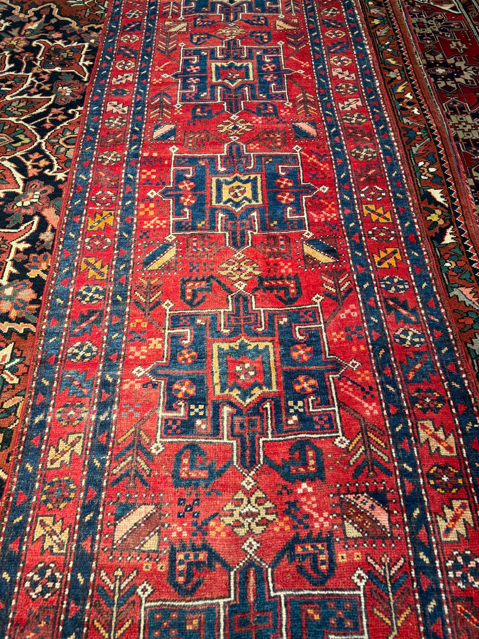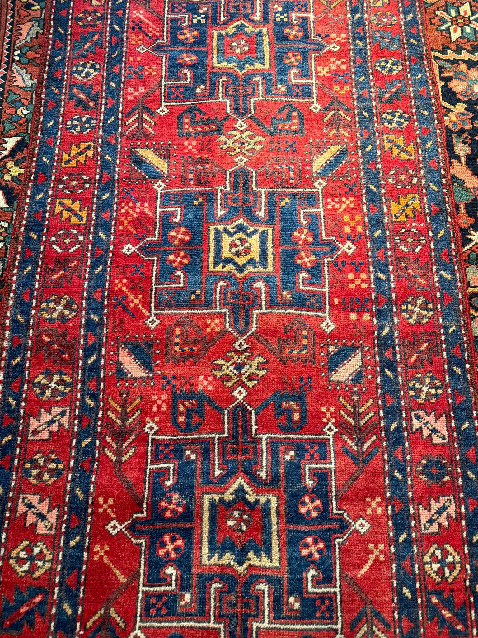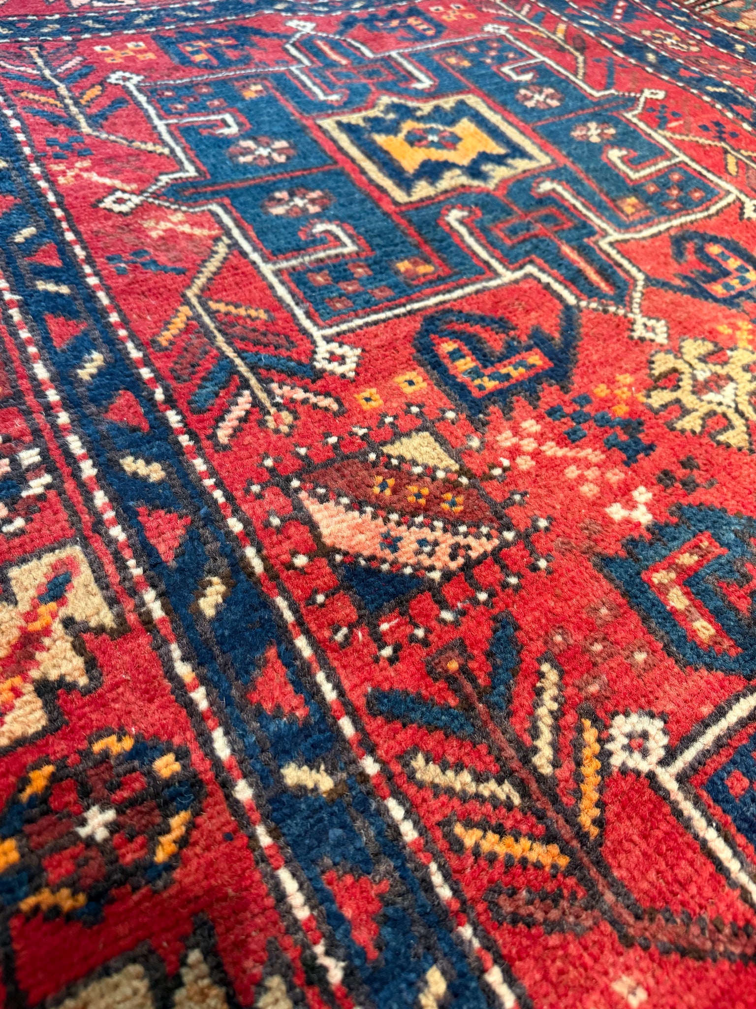 A stunning vintage Gharajeh runner with an eye-catching array of colors! The contrast between the reds, blues, whites immediately catch your attention on this piece. The colors are made from natural dyes, such as plants, insects, and other natural materials sourced in Iran. This runner presents a low pile, but is still soft on the feet, and great for any living space. Great size runner for a hallway or bedroom!