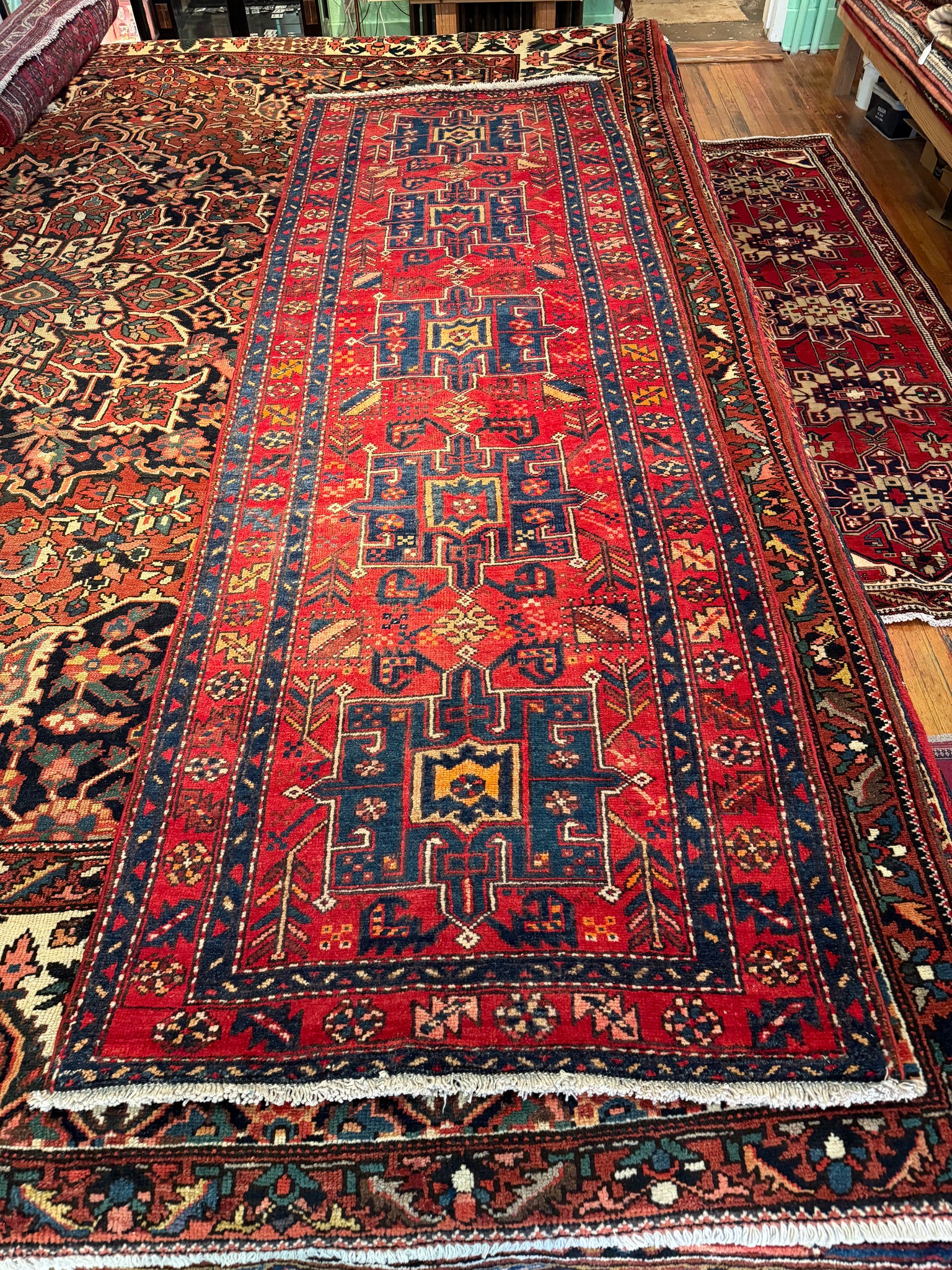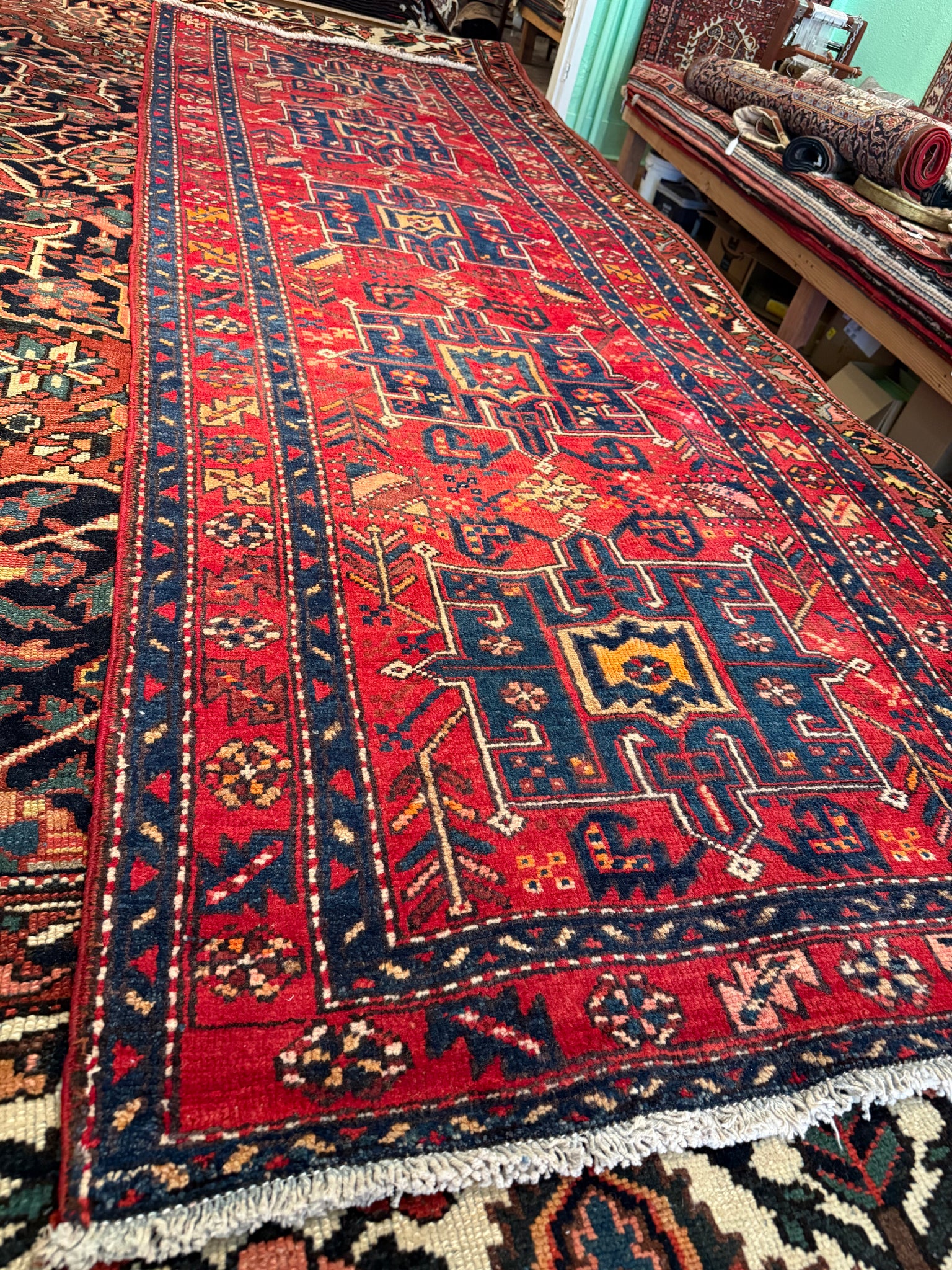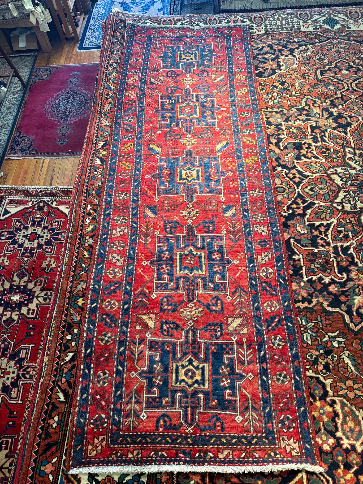 A stunning vintage Gharajeh runner with an eye-catching array of colors! The contrast between the reds, blues, whites immediately catch your attention on this piece. The colors are made from natural dyes, such as plants, insects, and other natural materials sourced in Iran. This runner presents a low pile, but is still soft on the feet, and great for any living space. Great size runner for a hallway or bedroom!