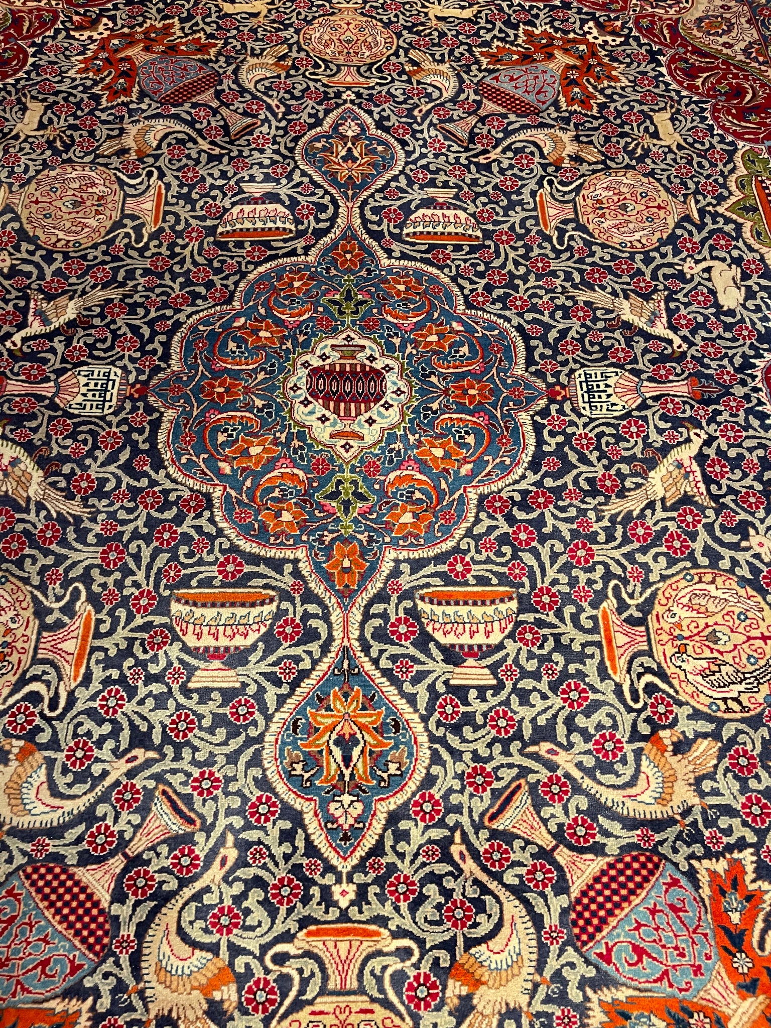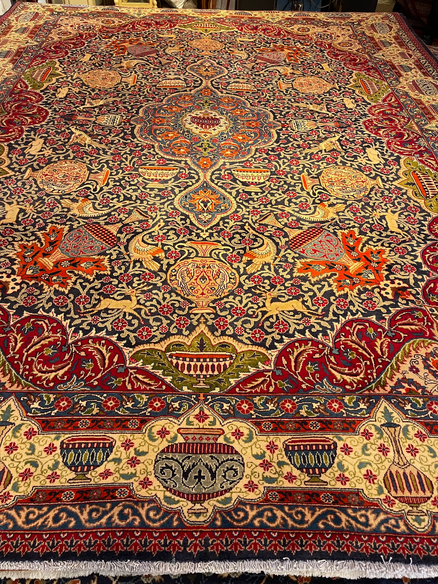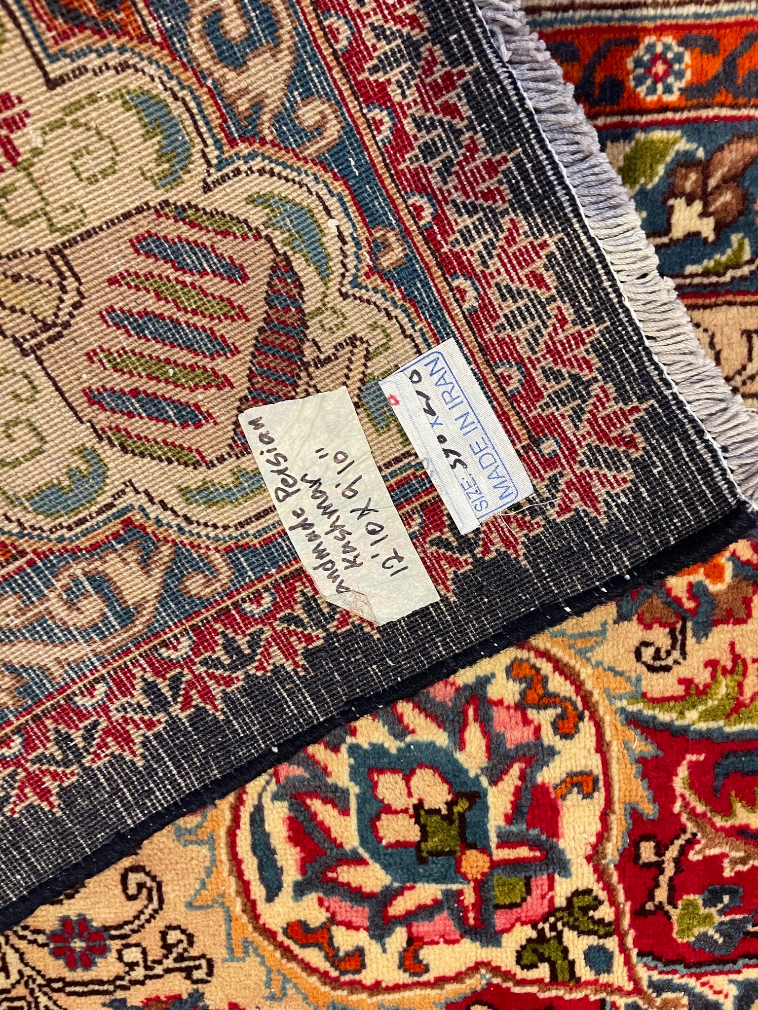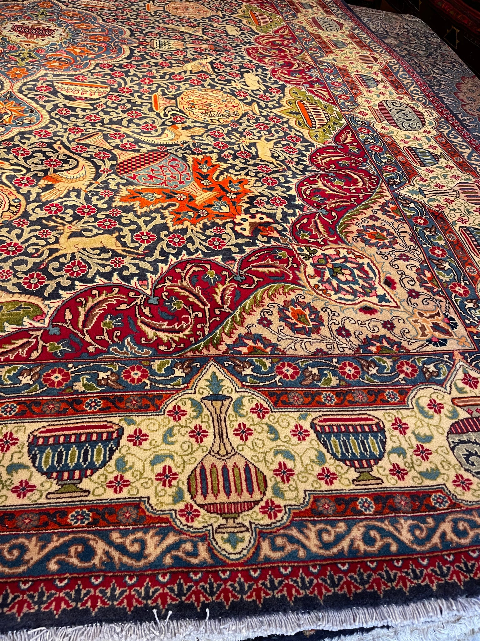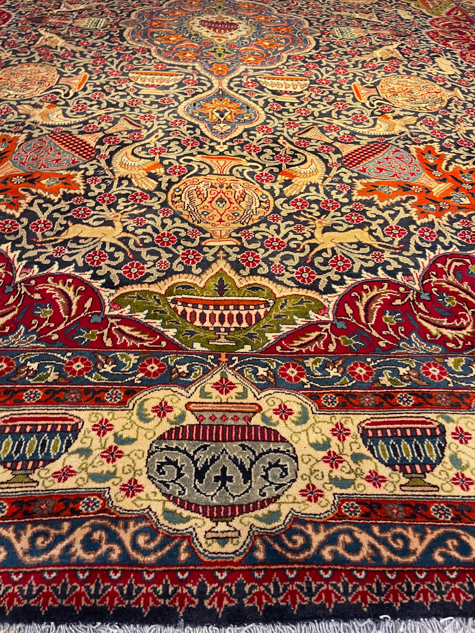 This beautiful vintage Kashmar has made its way into our Denver showroom! This rug presents a variety of rich colors including reds, yellows, blues, oranges, and more! These colors complement each other as well as the various detailed geometric designs throughout. These colors are derived from organic materials sourced locally in Iran. The hand-spun wool is also harvested from mountain grazed sheep, local to Iran. This eye-catching rug will surely adorn any home it's in. Great size rug for a living room, bedroom, or dining room!