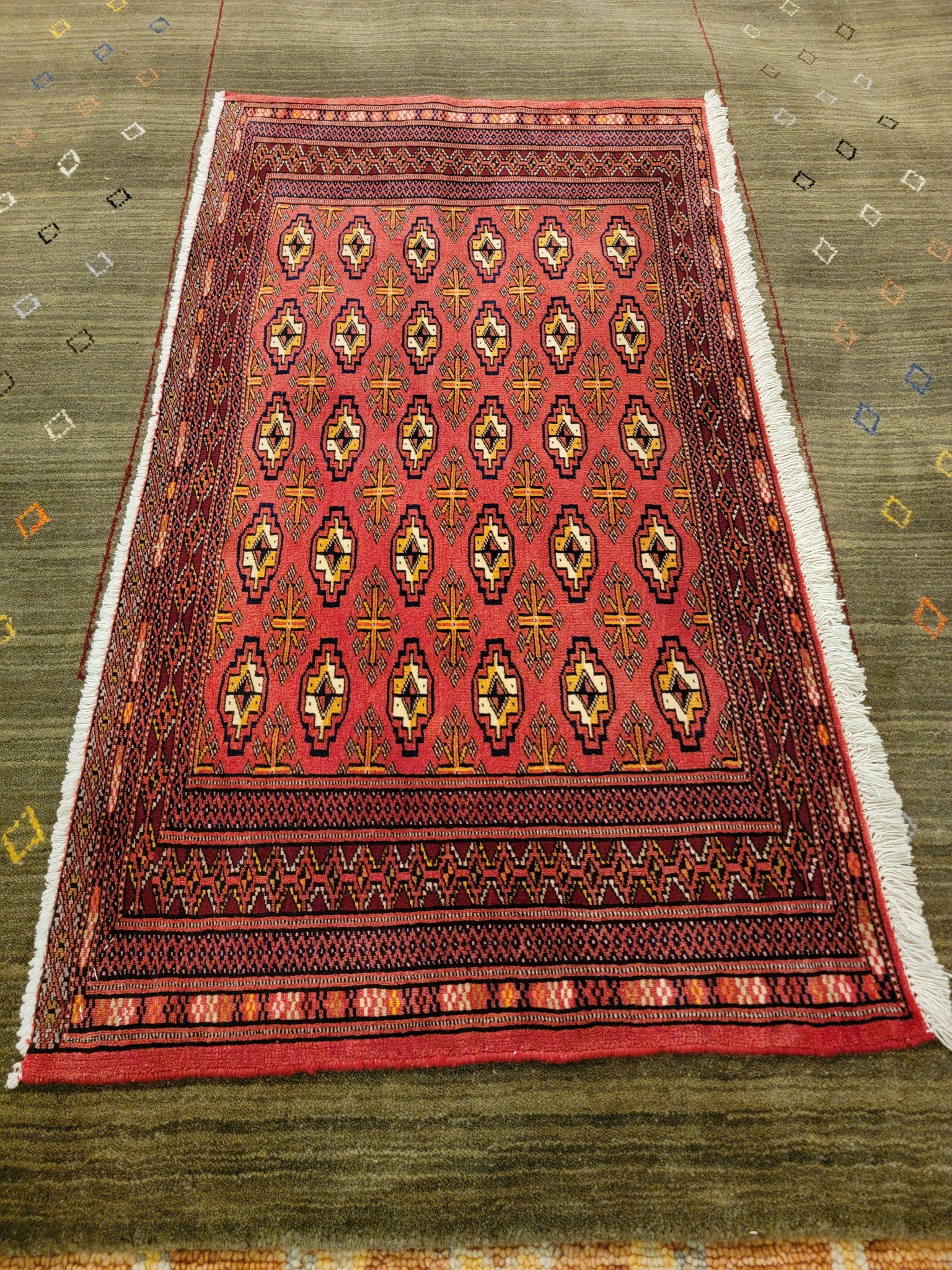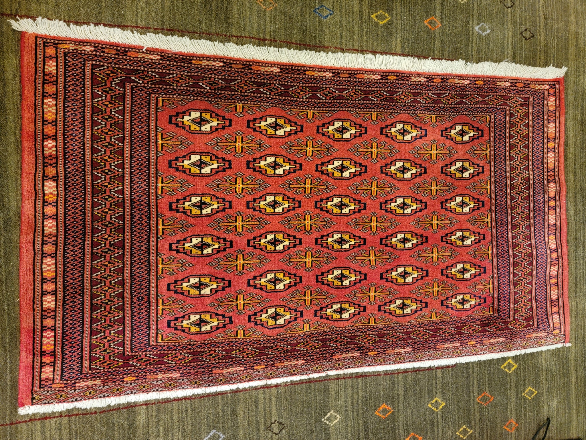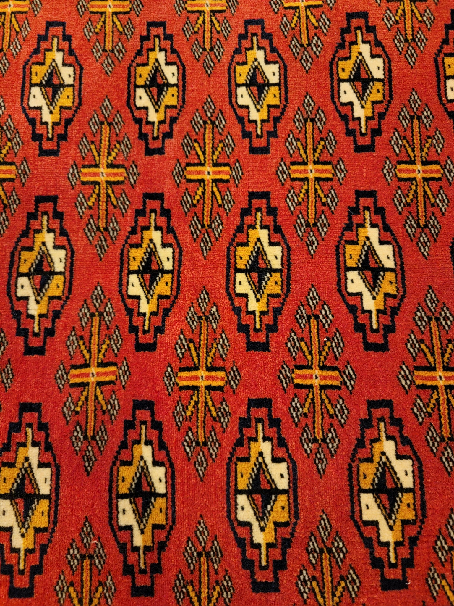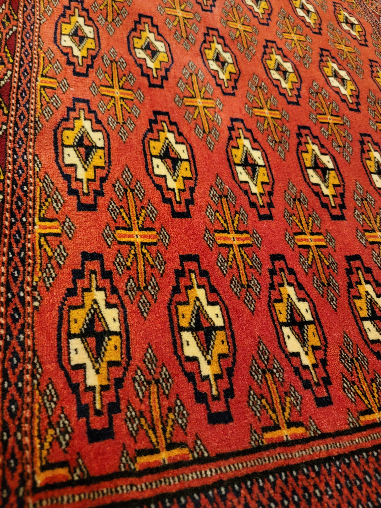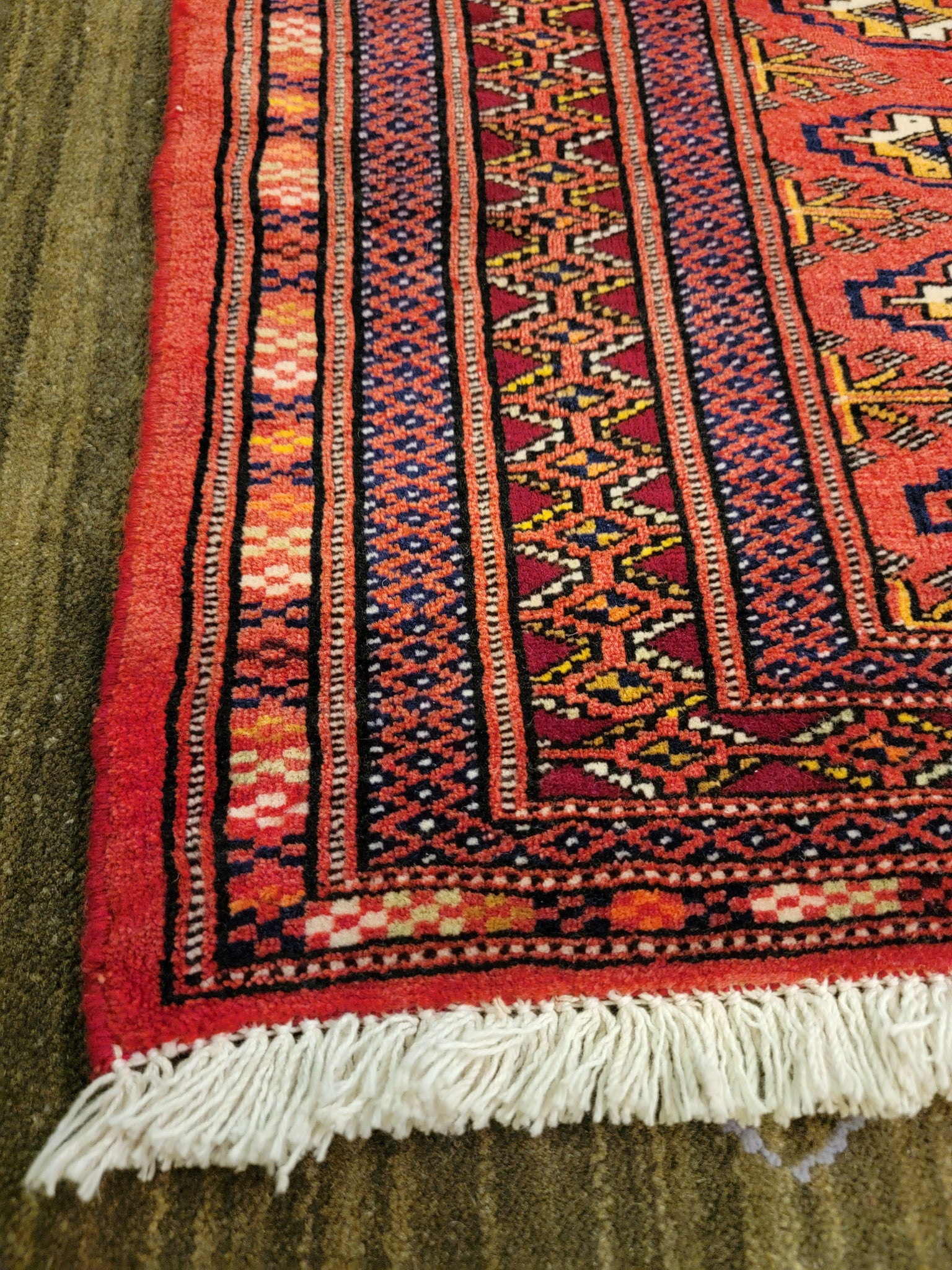 This IMMACULATE vintage Turkoman has made its way into our Denver showroom! This rug is surely going to adorn any home with intricate geometric designs, a saturated color scheme, and healthy wool pile. The rich reds, bright yellows, and black accents really complement each other, as well as the various geometric patterns throughout. This finely woven Turkoman is an excellent example of quality organic materials meeting Persian craftsmanship. This stunning vintage piece is clean and ready for its forever home!